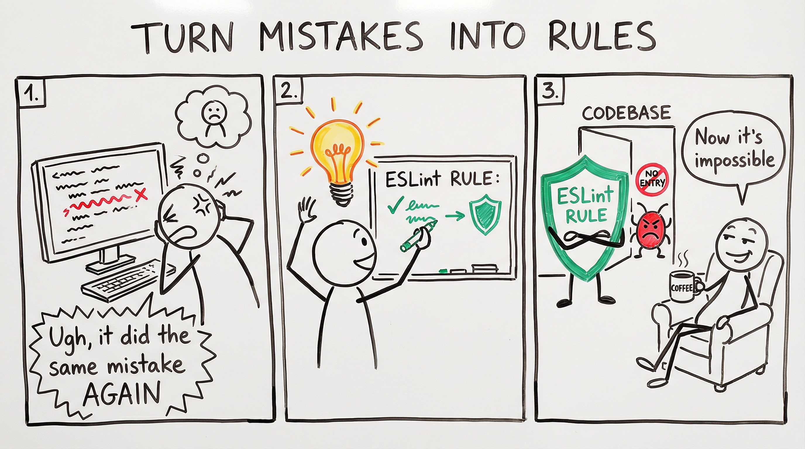 These are just examples. The point isn't to copy my rules. The point is: what mistakes does AI keep making in your codebase? What patterns do you keep correcting? Those are your rules. Write them. Every rule you encode is a class of errors that becomes impossible.