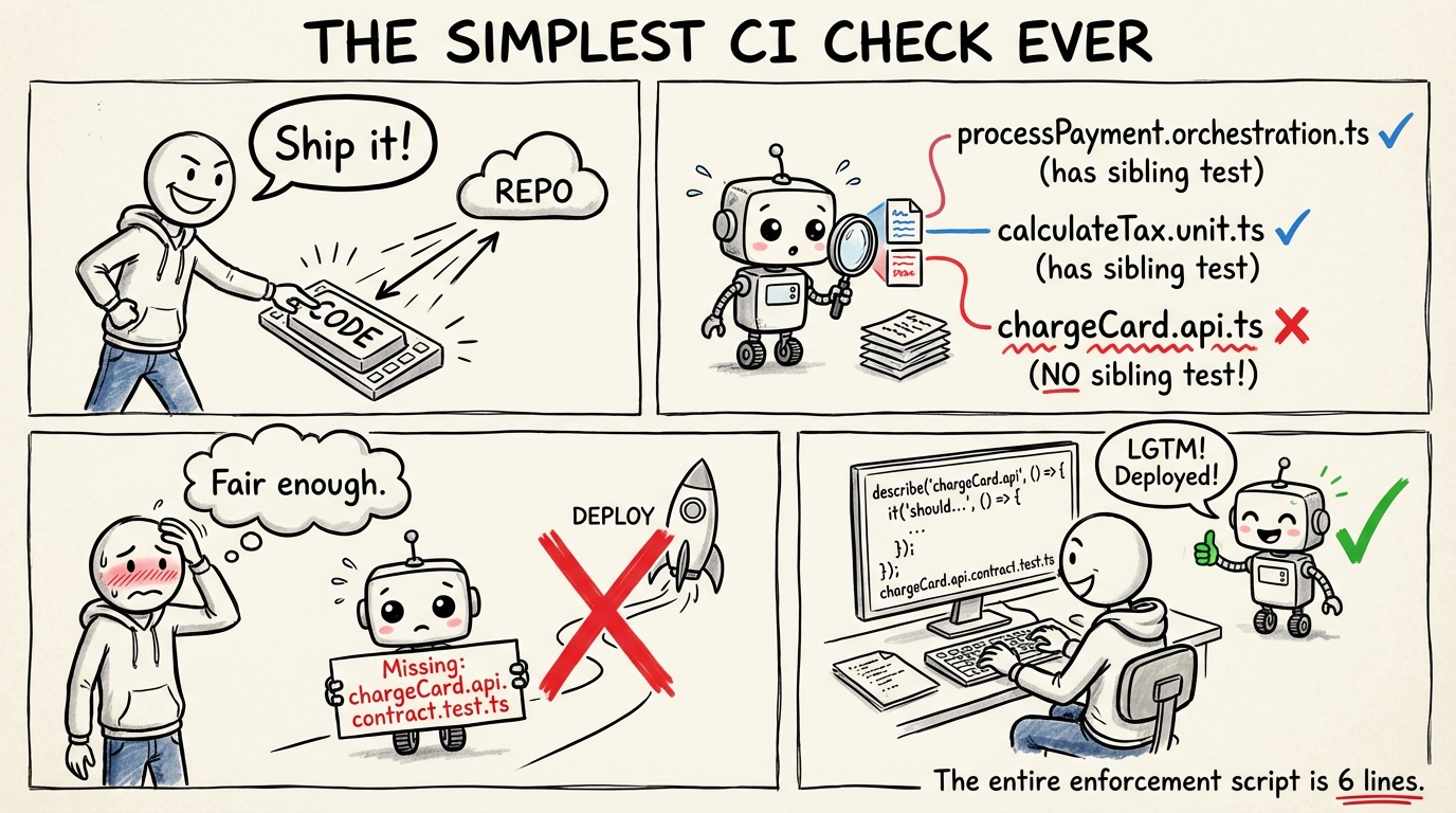 No coverage tools. No config. No arguments about thresholds. If the sibling file exists, you're covered. If it doesn't, the check fails.