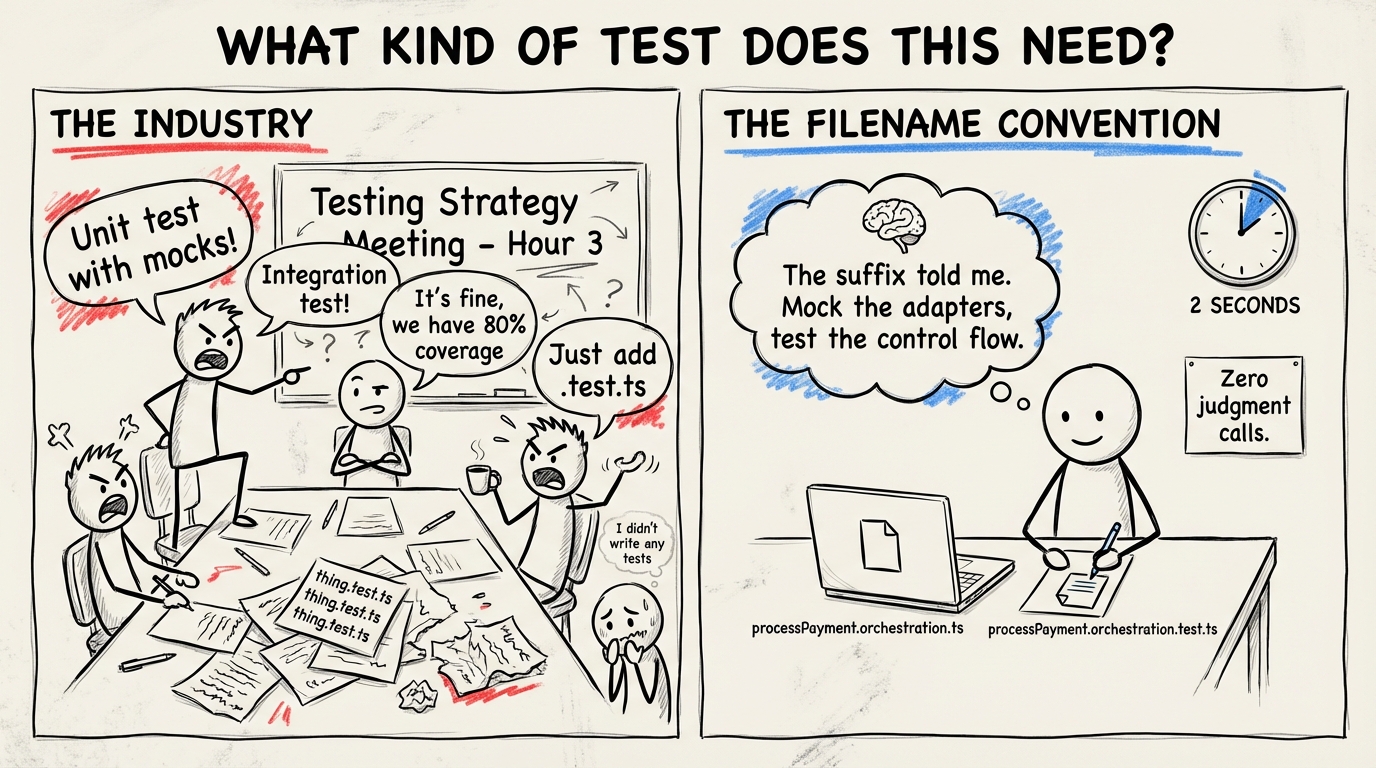 The file suffix convention is just the enforcement mechanism. The actual idea is simpler: move the "what kind of test does this need?" decision from an afterthought into the moment you create the file. Make it impossible to skip. Make it impossible to get wrong.