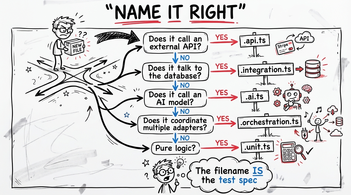 Before you write a file, you have to decide: does this touch a database? Call an external API? Use AI? Coordinate other files? Or is it pure logic? That decision shapes how you test it.