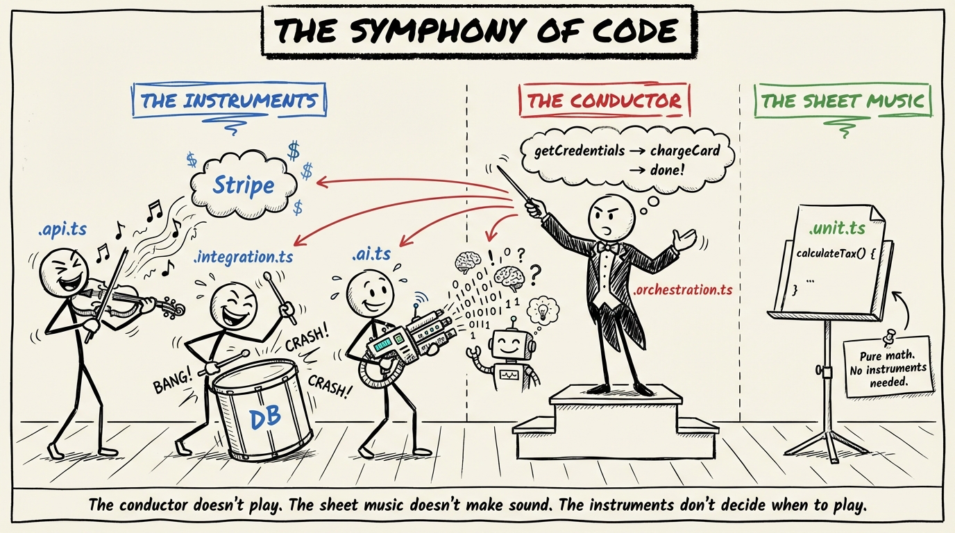 .api.ts/.integration.ts/.ai.tsare the instruments. They interact with the physical world and execute I/O..unit.tsis the sheet music. It defines the pure rules, math, and logic, but makes no sound itself..orchestration.tsis the conductor. The conductor doesn't play an instrument and doesn't write the music — their only job is to read the sheet music, tell the instruments when to play, and pass information between them.